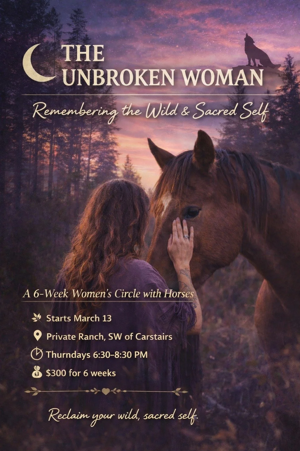Held on the land, in relationship with horses, this women’s circle is an invitation to reconnect with your wild, sacred, instinctual feminine self. Through presence, ritual, and equine-informed experiences, we gather to listen inward, soften, and remember what has always lived within us.
